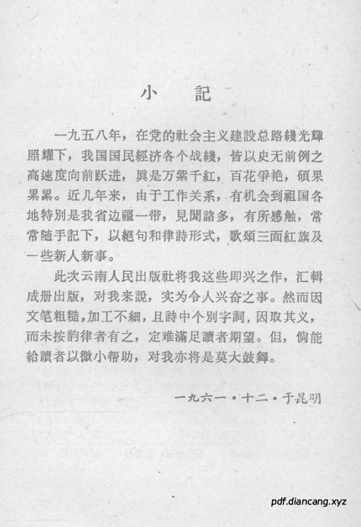 《春花赞》是开国中将周赤萍创作的诗歌集,诞生于他 1958 年至 1964 年担任云南省委书记期间。这段地方工作经历中,西南边陲的秀丽风光与浓郁民族风情,激活了这位戎马半生将领的文学情怀,让惯握钢枪的手拿起笔杆,写下诸多饱含情感的诗作。诗集的风格贴合周赤萍的文字特质,简洁刚健且深长隽永,既有革命岁月沉淀的厚重感,也不乏对生活与时代的热忱赞颂。其中收录的作品,或追忆革命征程中的牺牲与坚守,如他在遵义红军烈士墓前创作的悼亡诗,尽显碧血丹心的家国情怀;或描摹新时代的风貌与希望,凝聚着对祖国建设、人民幸福的真挚期许,是一位 “军中儒将” 将战火中的信念、和平年代的感悟熔铸于文字的生动写照。