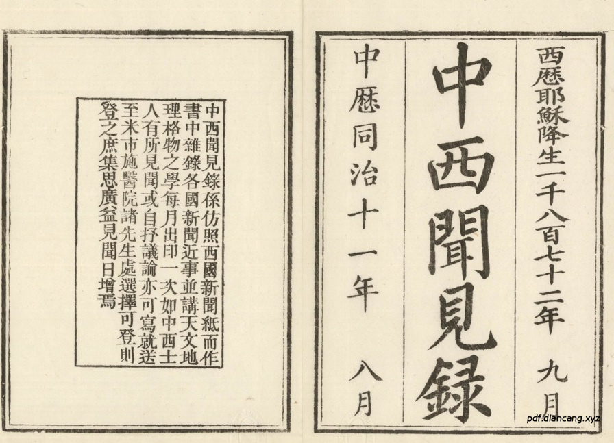 北京第一个中文近代报刊。1872年8月在北京创刊。月刊。为在京英美传教士成立的“在华实用知识传播会”创办的机关刊物。山京都施医院编辑,美国长老会传教士丁韪良主编,英国传教士艾约瑟、包尔腾等参加编辑。撰稿者多为丁韪良任总教习的京师同文馆外国教习,该馆李善兰等中国师生也曾撰稿。据该刊第1号所载《中西闻见录序》称:“其书内所论者,乃泰西诸国创制之奇器、防河之新法,以及古今事迹之变迁、中西政俗之同异。”又说:“书中杂录各国新闻近事并讲天文、地理、格物之学。”该刊内有论说、天文、地理、物理、化学、医学及各国新闻、近事、杂记、寓言等栏目。内容分为两大部分:一为科学技术知识的介绍,二为东西各国新闻报道。曾刊有介绍电报、电机、瓦斯、铁工业、照相术、蒸汽机用途及预防水灾方法等方面的文章。郑观应《盛世危言》中的部分篇章也曾在该刊发表。它不登商业广告,也避谈宗教与政治。每期印刷1000份,大多免费散发,主要对象为北京的官绅学界。1875年8月,该刊随“传播会”的解散而停刊,共出36期。1877年,丁韪良又将已出版的《中西闻见录》“择其体要”,编成《中西闻见录选编》4卷,重印后发行。该刊停刊后,所有订户及撰稿人都转到英国传教士傅兰雅在上海主持的《格致汇编》。