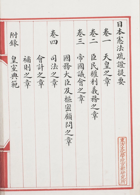 全书共四卷,为清光绪宣统年间内府朱丝栏钞本,未题书写者。共三十种宪政类书籍提要,始于:日本宪法疏证提要。终于:日本统计类表叙论提要。应该是清末预备立宪时期,进呈给光绪皇帝阅读的宪政书籍提要,内容包括:宪法、国会、税法、制度、教育、货币、司法等等。