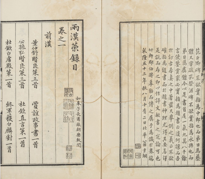 《两汉策要》在明嘉靖年间由著名藏书家周良金收藏,到明末清初,又被有 “海内第一藏书家” 之称的毛晋所收藏,成为其 “汲古阁 ” 中最被珍视的藏品。此本明末清初毛氏汲古阁存时已为十四册(缺卷三),清乾隆间为赣州知府张朝乐所得,延请名家穆大展刊刻成此本。