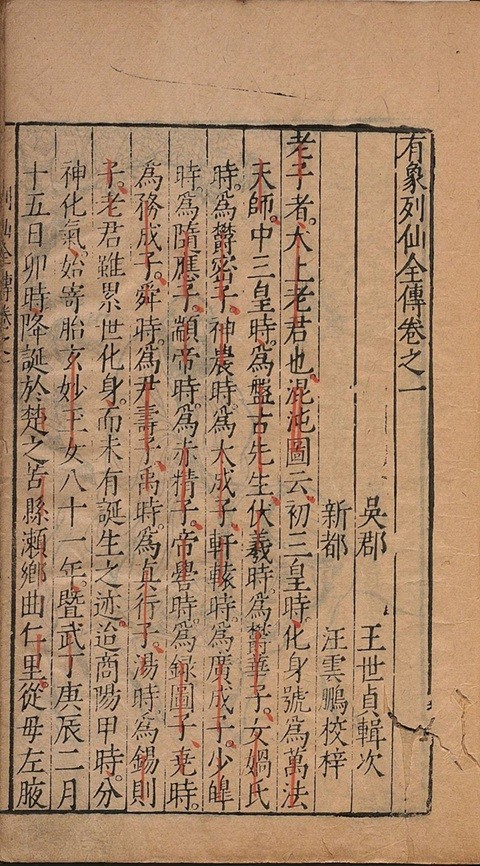 明王世贞辑、汪云鹏补辑《有象列仙全传》九卷,因书中神仙多数都配有画像插图故名“有象”,此书前八卷署名“吴郡王世贞辑次”,学者多认为是借助王世贞之名 而加强此书的影响力,八册本及四册本藏于国家图书馆;全书九卷,以时序为纲,收录上古至明中期五百多位得道之士的神仙故事,始于道祖老子,终于明代道士周思德,图文并茂。书内节选仙人加以图绘,有列仙版画两百多幅,为徽刻名家黄一木刻。此为明万历时期书林杨初虹刊(翻刻玩虎轩)本。
