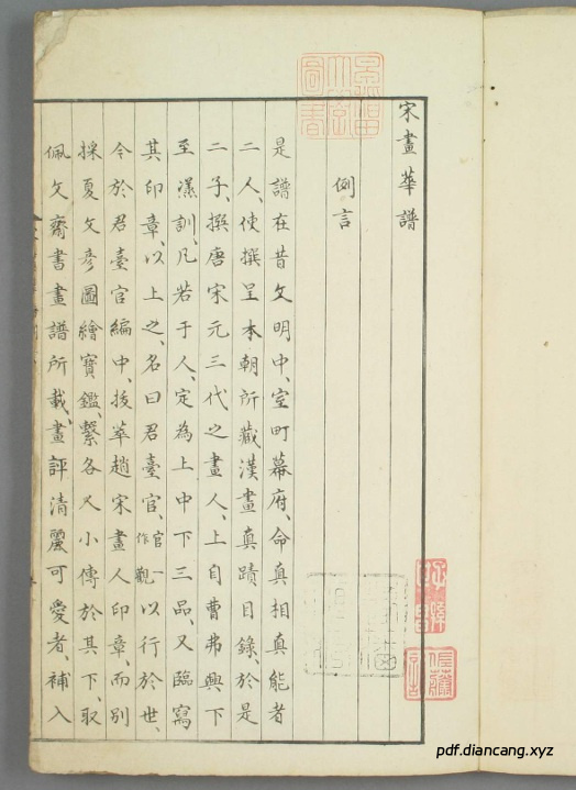 《宋画华谱》系日本室町幕府文明年间,奉幕府之命由两位能者编撰的汉画著录著作。全书收录唐、宋、元三代画人(上起曹弗兴,下至陈训),按上、中、下三品分类,辑录其真迹目录与印章,且附各人小传,补入《佩文斋书画谱》中清丽可赏的画评。
