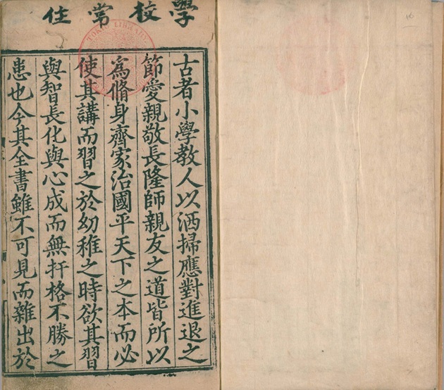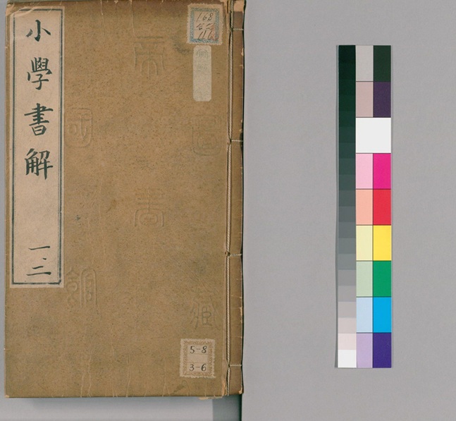 《小学》旧题宋代朱熹撰,实为朱熹与其弟子刘清之合编。全书分内外两篇。内篇有四个纲目:前三个是立教,明伦,敬身,第四个是鉴古。外篇分两部分:一是嘉言,二是善行。此书《标题音训小学书解》共四卷,前有小学序、版画插图六幅、朱文公小学题辞。其内容为对《小学》的训诂注解。此本大致为明代刊本。书前有版画插图六幅:晦庵朱子小影、弟子受业之图、世子问寝之图、子妇尝药之图、子事父母之图、妇事舅姑之图。