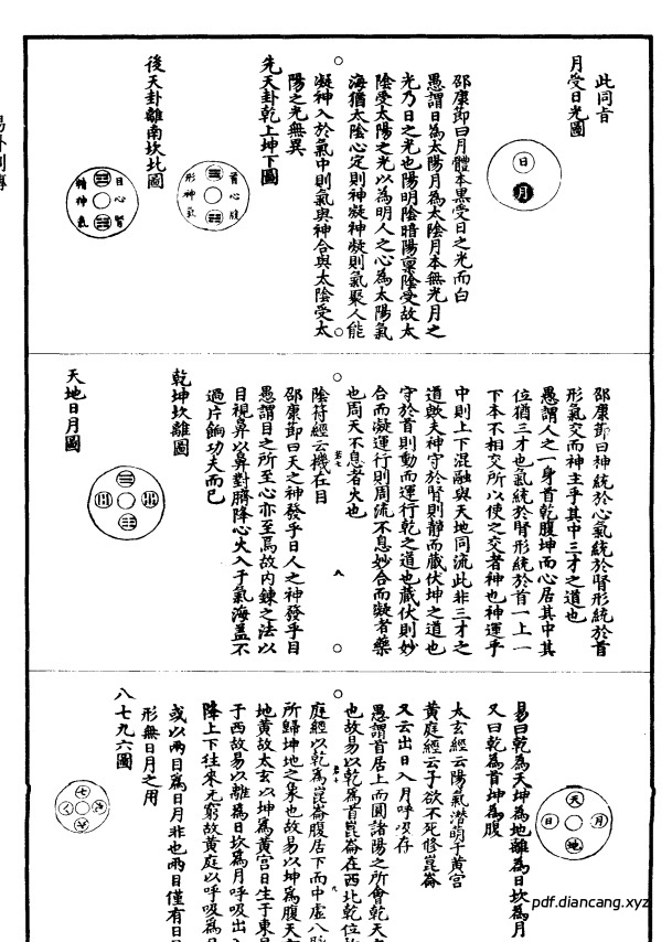 全书以图解《易》为特色,收录邵雍《心为太极图》、朱熹《太极虚中先天图》等十余幅图式,将卦象次序与人体修炼结合,提出“金丹为心中之易”“天根月窟”等炼养理论。通过解析先天图奥秘,以阴阳交感阐释内丹火候与气血运行,强调“身中之易”的养生主题,构建道教易学与丹道相融的修炼体系。现存版本包括《正统道藏》及四库全书本。