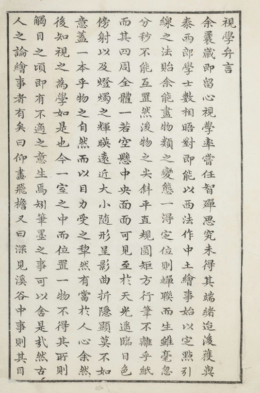 二卷。清年希尧(?—1738)撰。年希尧,字允恭,广宁 (今辽宁北镇县)人。先后在云南、河北、安徽等地做官,一生从政,但对科学研究很感兴趣,每赴新任时必带上科技图书和仪器。他主要研究数学和医学,对工程图学兴旨尤高,著有《测算刀圭》三卷(1718)、《面积比例便览》一卷(1735)、《视学》二卷(1729)、《对数广运》一卷、《对数表》一卷、《算法纂要总纲》、《万数平立方表》等。《视学》是中国最早的有关透视学方面的著作,字迹图画,并极精美。在初版自序中,年希尧称:“余曩岁即留心视学,尝任智殚思,究未得其端绪。迨后获与泰西郎学士数相晤对,即能以西法作中土绘事。始以定点引线之法眙余,能尽物类之变态,一得定位,则蝉联而生,虽毫忽分秒,不能互置。”郎学士即1715年来华的意大利传教士郎世宁(1688—1766),善透视画法,曾给年希尧一本讲透视的书。年希尧认为这书 “切要著明”,但图形太少,于是以它为蓝本,“悉次为图,公诸同好”,写成《视学》于1729年刊刻出版。年希尧并不满足,又经数年研究,复于1735年将 《视学》增订再版,在再版序言中他说:“视学之造诣无尽也,予曷敢遽言得其精蕴哉。虽然予究心于此三十年矣。…先是予粗理其端绪,刊图问世,特豹之一斑,而鼎之一脔,虽已公诸同好,终不免于肤浅。近得数与郎先生讳世宁者往复再四,研究其源流,凡仰阳合复,歪斜倒置,下观、高视等线法,莫不由一点而生。迨细究一点之理,又非泰西所有而中土无者。”“予复苦思力索,补缕五十余图,并为图说,以附益之;亦可云克物类之变化,而广点线之推移,直探斯法之源流,为视学之梯航矣”。在书中年希尧作了大量精美的例图,多为中国与西方建筑物及器皿等图样,所作诸图均合投影作图原理。他清楚地叙述了透视原理,其特点是用从一点射出之光线将物体投影到一平面上,宜于画远景。景物在透视图上是远小近大,年希尧对此有明确的认识,他说: “凡目之视物,近者大远者小,理所固然,即如五岳最大,自远视之,愈远愈小,然必小至一星之点而止。”