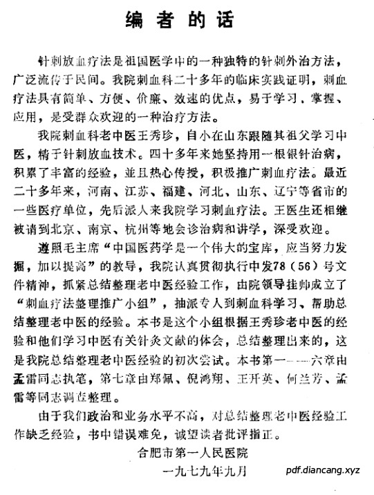 遵照毛主席“中国医药学是一个伟大的宝库,应当努力发掘,加以提高”的教导,我院认真贯彻执行中发78(56)号文件精神,抓紧总结整理老中医经验工作,由院领导挂帅成立了“刺血疗法整理推广小组”,抽派专人到刺血科学习,帮助总结整理老中医的经验。本书是这个小组根据王秀珍老中医的经验和他们学习中医有关针灸文献的体会,总结整理出来的,这是我院总结整理老中医经验的初次尝试。本书第一————六章由孟雷同志执笔,第七章由郑佩、倪鸿翔、王开英、何兰芳、孟雷等同志调查整理。