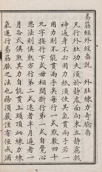 此《易筋经外经图说》(附八段锦图)是易筋经的重要支流,可用于强身健体,益寿延年。此书前半部分是十二大劲,内容与二十二势易筋经第一套十二势一样。后半部分是八段锦,口诀是现代八段锦口诀的蓝本,书前有清末民初梁世昌序。此为清末上海同文书局石印本。 《易筋经十二大劲》从创立之初,乃是为了训练功力之用,尤其是上肢部位的筋肉功力,人体肌肉的特性为收缩,紧张肌肉,正是由肌肉的收缩来逐渐刺激内里的组织,同时掌、指为人体经筋之余,刺激肢体末端,自然有易筋之效,如上面陈太平先生所言,不能一味求紧,尤其是不能只追求肌肉之紧,否则只能作用于肌肉,且致肌肉劲力僵化而不能快速转换,用于实战武功之基础则殊为可惜。