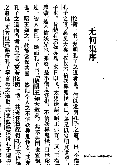 该书是一部较有条理的破除迷信禁忌,批判宗教神学,宣扬无神论的资料集。共十四卷。其前十二卷除选录王充《论衡》中的辟神怪祸福之说和辑录其他书中有关资料外,还加上自己的评论,取名为《论衡精选》,又称《无何集》。第十三卷和第十四卷分别选录诸家辟佛教之说和杂取四部,名人,百家之言符合于王充《论衡》辟神怪祸福之说。