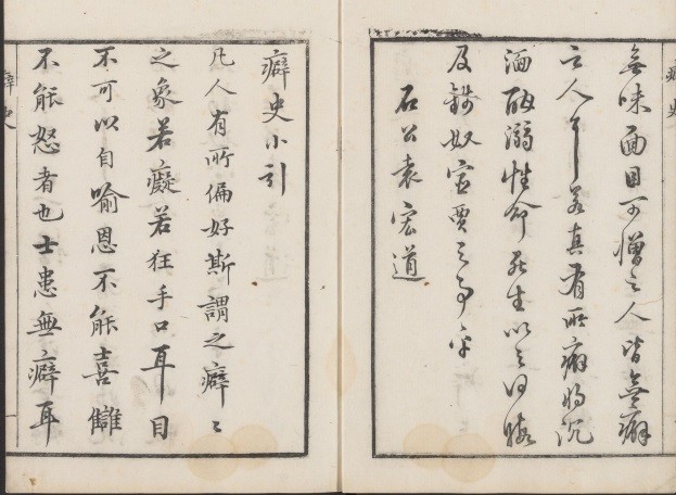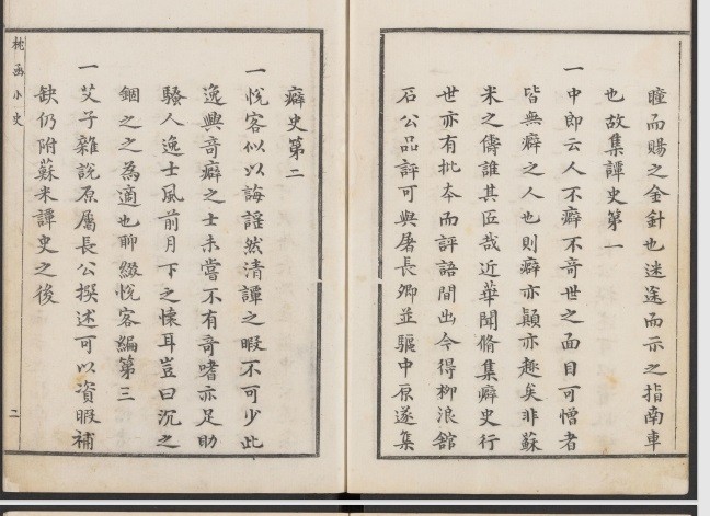 四卷 (《四库全书总目提要》题无卷数)。明闵于忱(生卒年及生平事迹均不详)撰。此书共汇刻书三种(《四库全书总目提要》谓分二种:一曰《谭史》,二曰《僻史》。盖其所用内府藏本为不全之本之故)。一为《苏长公谭史》二卷,题“吴兴闵于忱校,东明屠长卿评”。此书原为明郭化所辑,名《苏米谭史》 ( 《四库存目》 卷六十有著录),此书虽然仍附《米史》于《苏史》内,但另标出标题。《米中》之后,为东坡居士《艾子杂说》。闵于忱在《凡例》中说: 其仍附《苏米谭史》之后。二为《癖颠小史》(即《四库总目》谓之 《僻史》) 一卷,题 “闻道人撰,袁石公平”。原书为华淑撰,已收在《清睡阁快书》十种之中,有万历刊本。华淑,字闻修,所以此处称为闻道人。三为《悦容编评林》一卷,题“长水天放生辑,东明屠赤水评,西湖病渴子校。”天放生不知为何人,据梁溪一书生序,称天放生为萝月轩主人,也未著其姓氏。《谭史》有梅敦伦序、郭化序。《癖颠小史》有袁宏道序、汤宾尹序、闻修居士跋。《悦容编评林》有梁溪一书生序、长水天放生序。此书有明闵氏朱墨印本,共四册,现存于北京图书馆之中。