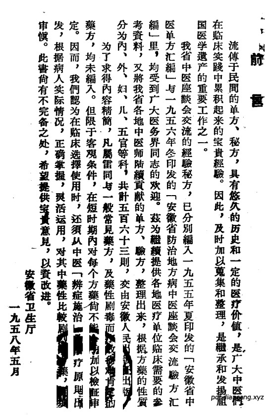 安徽省卫生厅主编,安徽人民出版社 1958 年 5 月出版,32 开、142 页、竖排平装,收录563 则经筛选的单方、验方、秘方,是建国初期安徽 “中医献方运动” 的官方成果,立足新安医学与江淮民间经验,主打简便廉验、临床可直接套用。