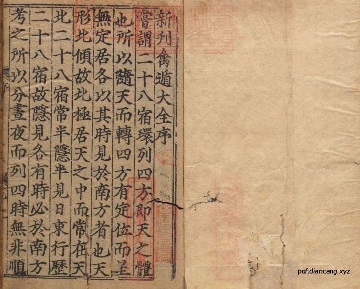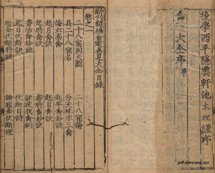 此《新刊禽遁大全》四卷附补全一卷,明池本理著。内容大致是旧时术数家用五行及各禽与二十八宿相配,以定日辰方位的吉凶。书内有相关图释及二十八宿(以各禽为诸宿之神:角木蛟、亢金龙、氐土貉、房日兔、心月狐、尾火虎、箕水豹、斗木獬等)插图。此为明弘治09年进贤书舍刊本。