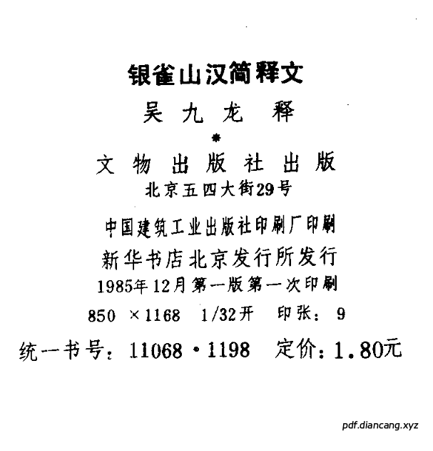 吴九龙编。1985年文物出版社出版。该书提供的是银雀山一号和二号汉墓中出土的,未经缀联、注释的简牍释文。一号汉墓出土的汉简,大致可分为传本书籍和古佚书两大类。传本书籍包括: