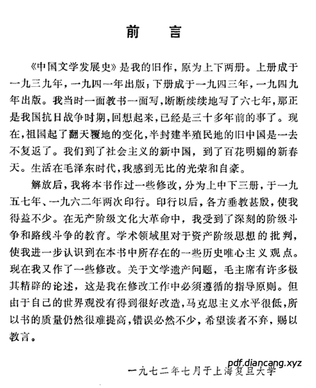 刘大杰(1904—1977),著名古典文学学者,复旦大学教授。《中国文学发展史》是其毕生代表作,初版于 1941—1949 年,历经 1957、1962 年两次修订;1973—1976 年版为文革期间最终修订本,分两册,受当时 “儒法斗争”“阶级分析” 等思潮影响,对 1962 年版做了政治性改写与删削,但学术主体与叙事框架仍存。