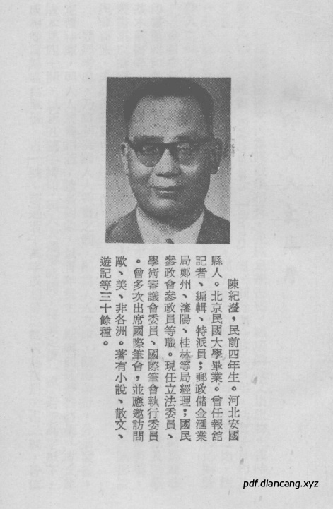 陈纪滢(1908-1997)是河北安国人,著名的记者、作家。他曾担任《大公报》东北秘密通讯员,后到台湾,主要从事写作和文艺活动,著有《东北踏察记》《新疆鸟瞰》《欧游剪影》等多部作品。在《西班牙一瞥》中,他以亲身经历为基础,用生动的文字描绘了西班牙的风土人情、历史文化、社会风貌等内容,为读者呈现出一个丰富多彩的西班牙形象。