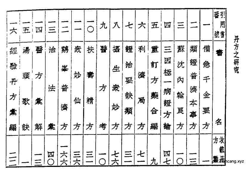 方剂索引。不分卷。日本冈西为人编于1931年。从“满洲医科大学”中国医学研究室所藏1600余种医籍中,选取记载丹方之医书322种,蒐辑丹方2405首,将丹方编目,按方名笔画,依辞典排列方式加以排列,编成一览表。一览表又分三栏:第一栏处方编号;第二栏处方名;第三栏为所出之处。现有《皇汉医学丛书》本。