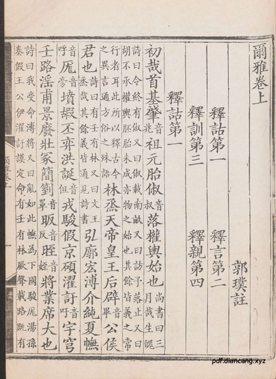 三卷。不著撰人名氏。按郭氏《尔雅注序》云:别为音、图,用祛未寤。考《隋志》载《尔雅图》十卷,注云:郭璞撰。梁有《尔雅图赞》二卷,郭璞撰,亡。所谓“图赞”者,当止有“赞”而无“图”,故止二卷。《新唐书·艺文志》又别出江灌《图赞》一卷,当亦有“赞”而无“图”。宋人书目俱不著录,则其亡已久。清周中孚《郑堂读书记补逸》云《尔雅音图》为曾宾谷(燠)得自曹竹虚(文埴),谓是宋本。因令姚(之麟)摹绘付刊。其书全载经文及郭注。经文加之以音,分注于各字之下。前四篇无图,《释宫》以下俱列图于前。然《释宫》、《释器》、《释乐》、《释天》、《释地》、《释丘》、《释山》、《释水》八篇,其图甚略,《释草》、《释木》、《释虫》、《释鱼》、《释鸟》、《释兽》、《释畜》七篇,无句不图,每图俱似点缀,与杨甲《六经图》所绘大异,疑为明代画家以意为之,决非宋人相传旧本。且郭氏《序》所谓音、图者,本各自为书,今此本并为一书之称,亦非古也。是编有艺学轩摹刊影宋钞本。