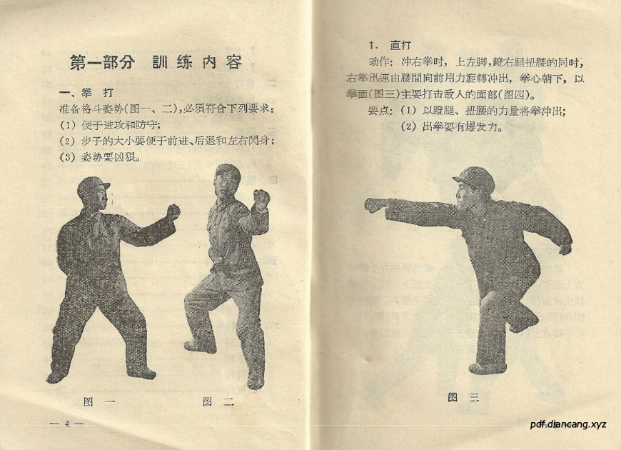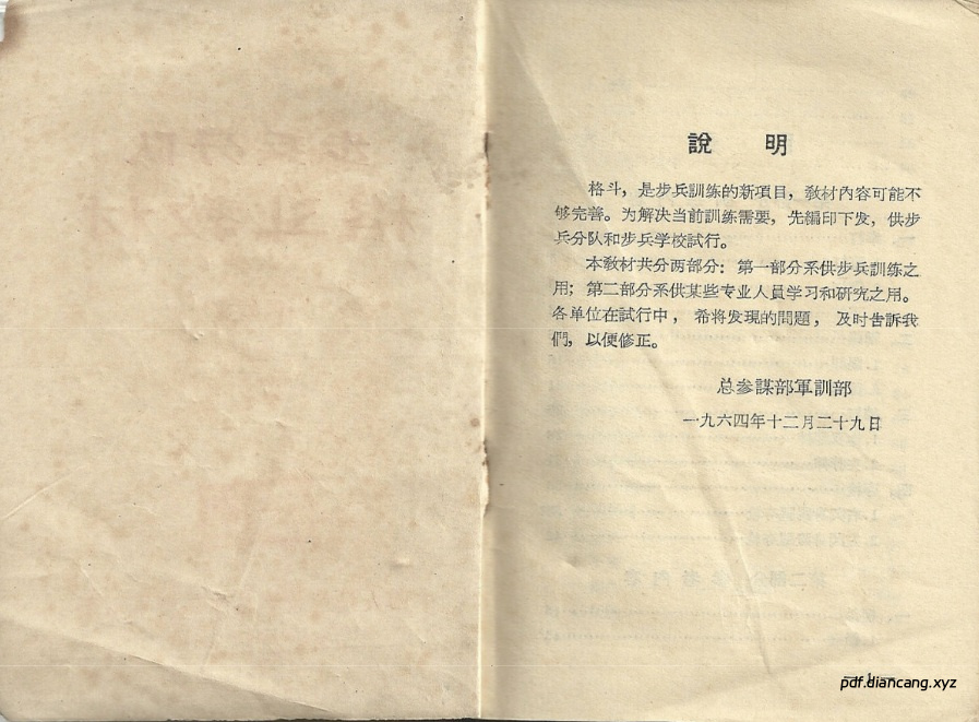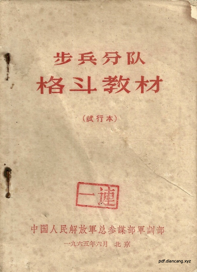 1964年出版,分教材分为上下两部分,第一部分是供步兵训练之用;第二部分是供某些专业人员学习和研究之用。书中采用图文结合的形式,,对各种格斗技巧,比如:拳打脚踢、摔打、夺枪、擒拿、冷兵器格斗等进行图解分析,实用性极强。